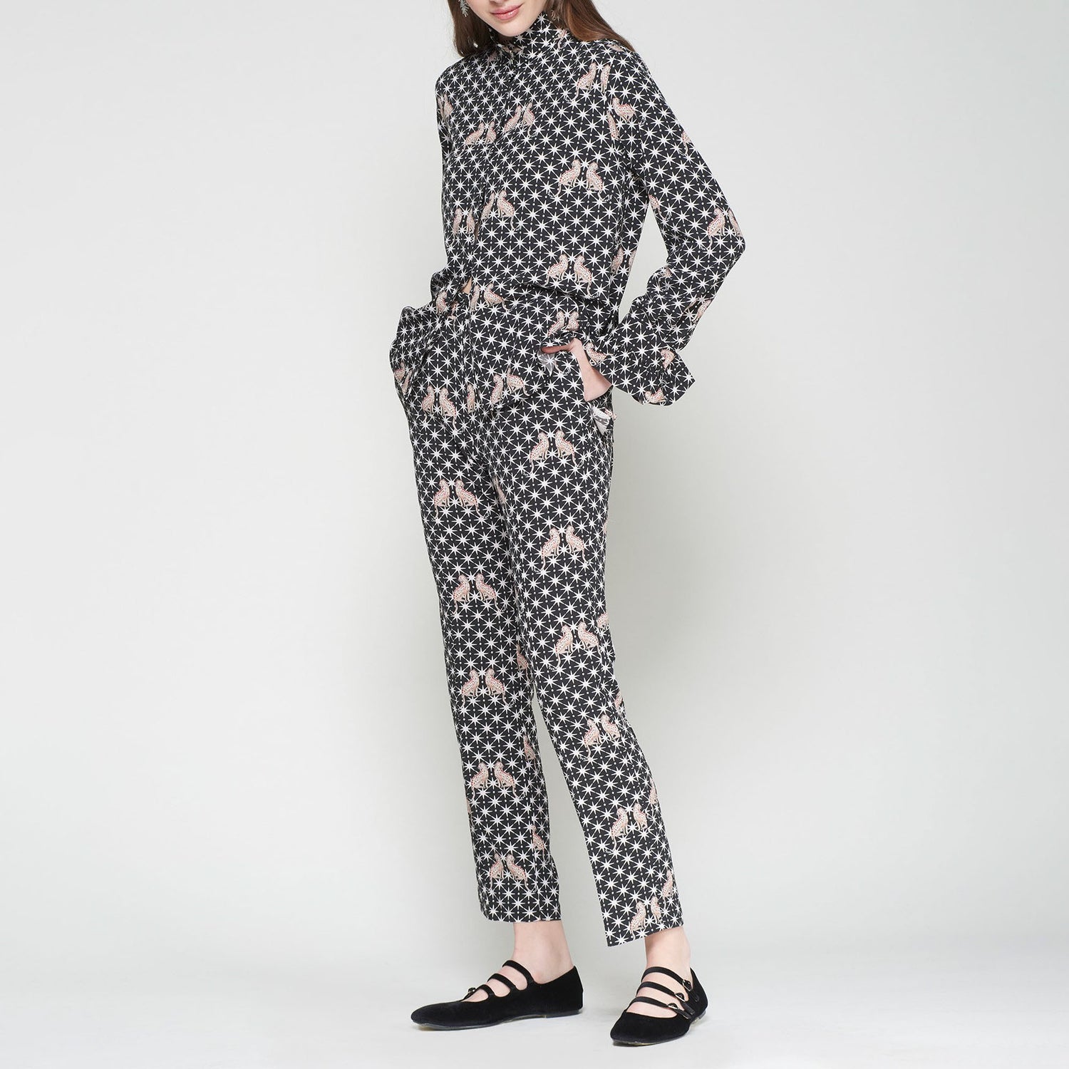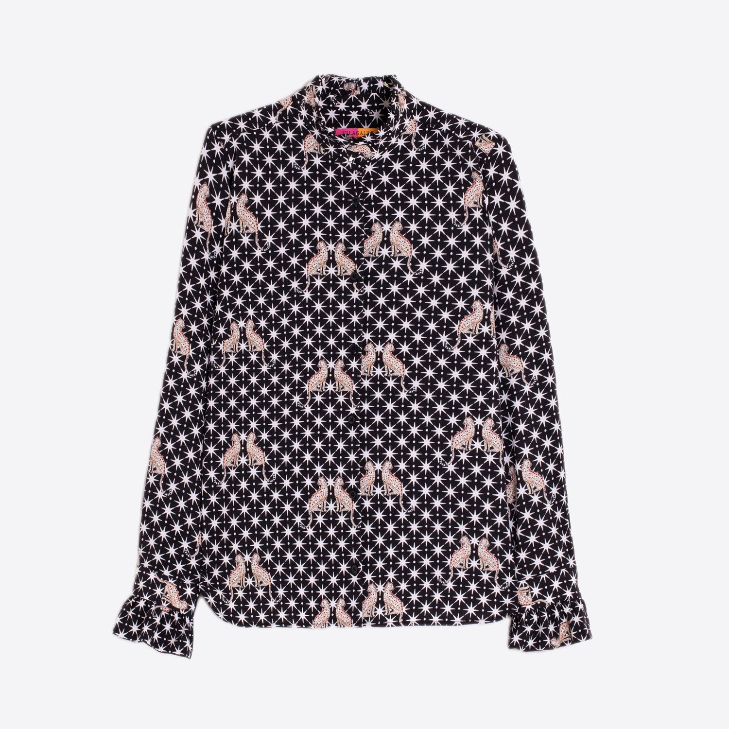 Black blouse featuring an all-over print of white stars and leopards. Designed with a high ruffled collar and a front button closure. Long sleeves are finished with frilled cuffs, and the silhouette offers a straight fit. Made from a lightweight, fluid fabric.