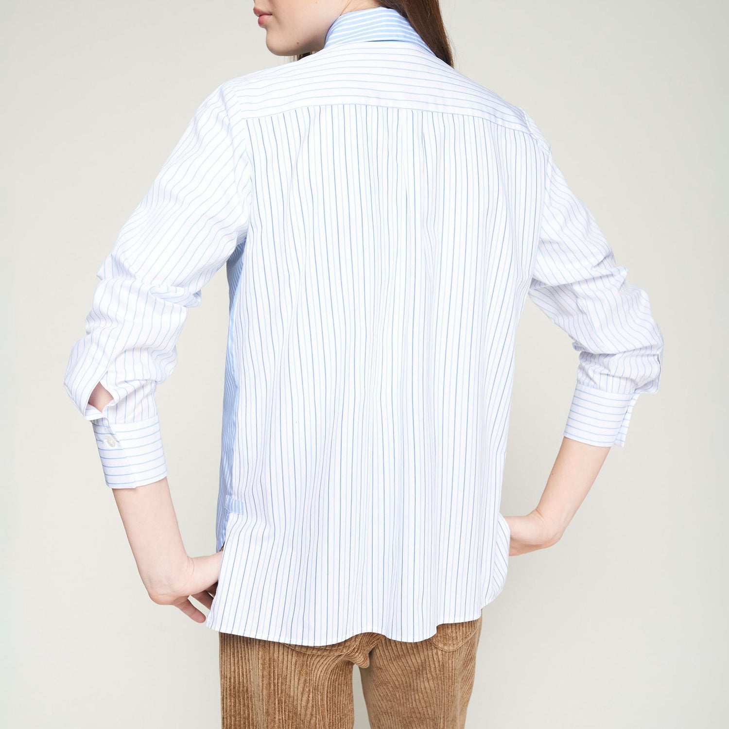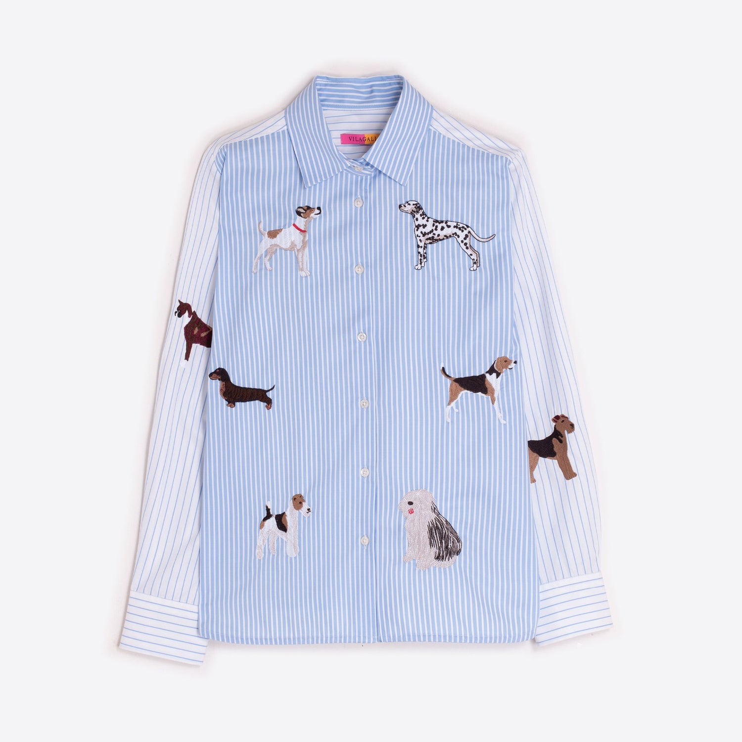 Light blue and white striped shirt with embroidered dog motifs across the front and sleeves. Classic shirt collar, visible button closure. Straight cut. Lightweight 100% cotton fabric. A playful and detailed piece for the fall-winter season.