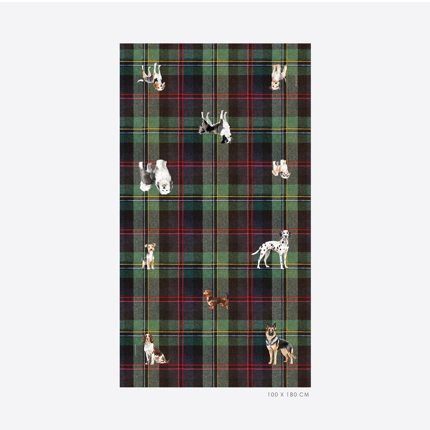Woof! Rectangular foulard with a green tartan base, playfully covered in charming dog illustrations. Made from a cosy blend of cotton, modal, and wool, it’s soft, fluid, and perfect for anyone who likes their accessories with a little bark and a lot of style.