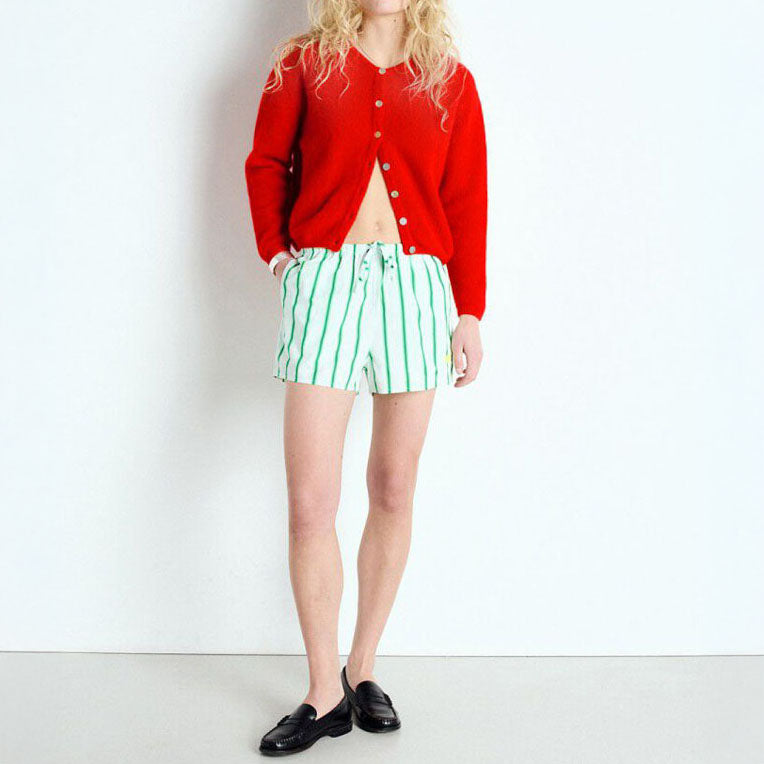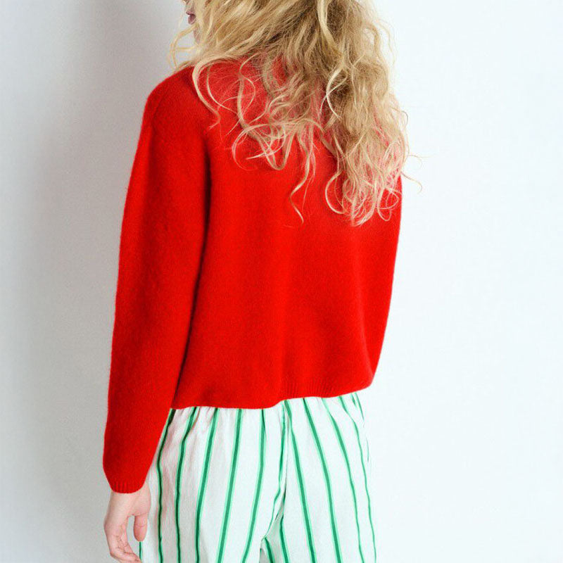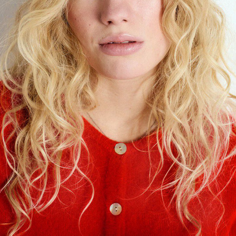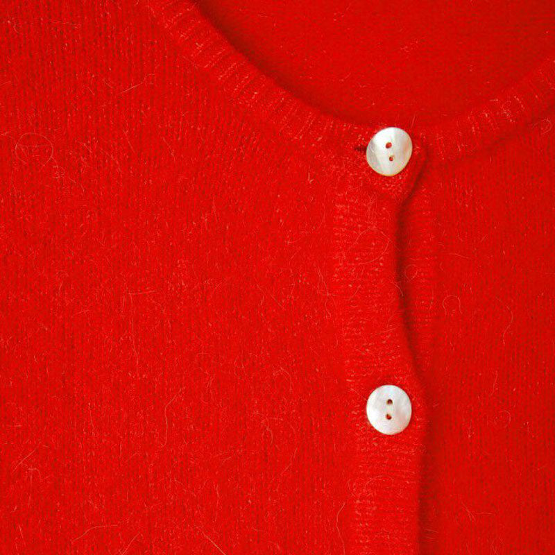 Introducing the Vitow Cardigan from American Vintage, a must-have for your wardrobe. Made from a soft alpaca blend, it comes in a vibrant red hue, featuring a round neckline and fun mother-of-pearl buttons. Cool, casual, and full of personality.