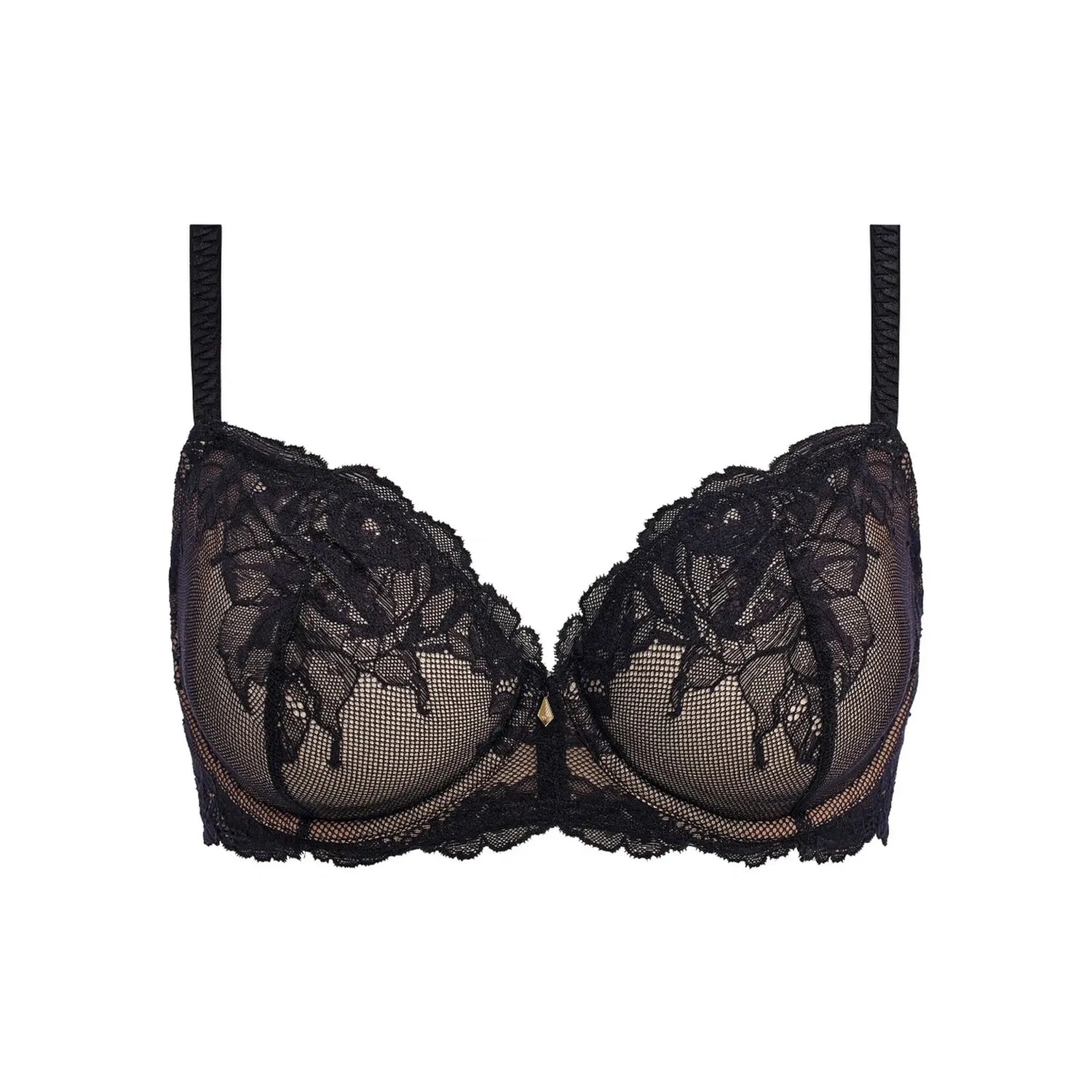 - Seamed lace cups with net lining for lift and natural shaping