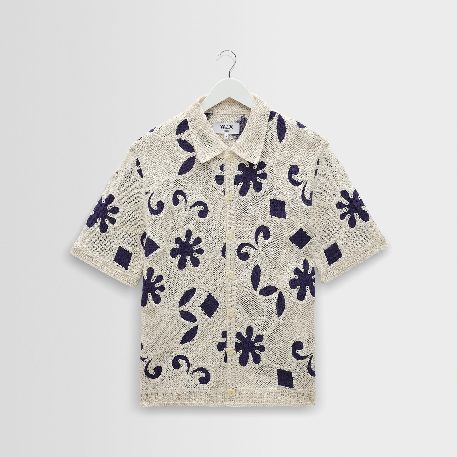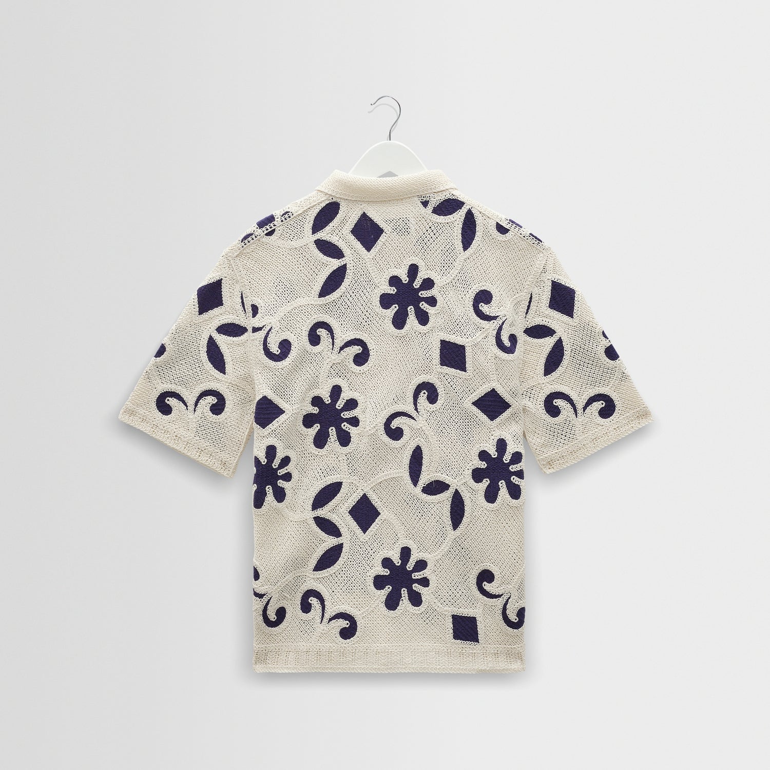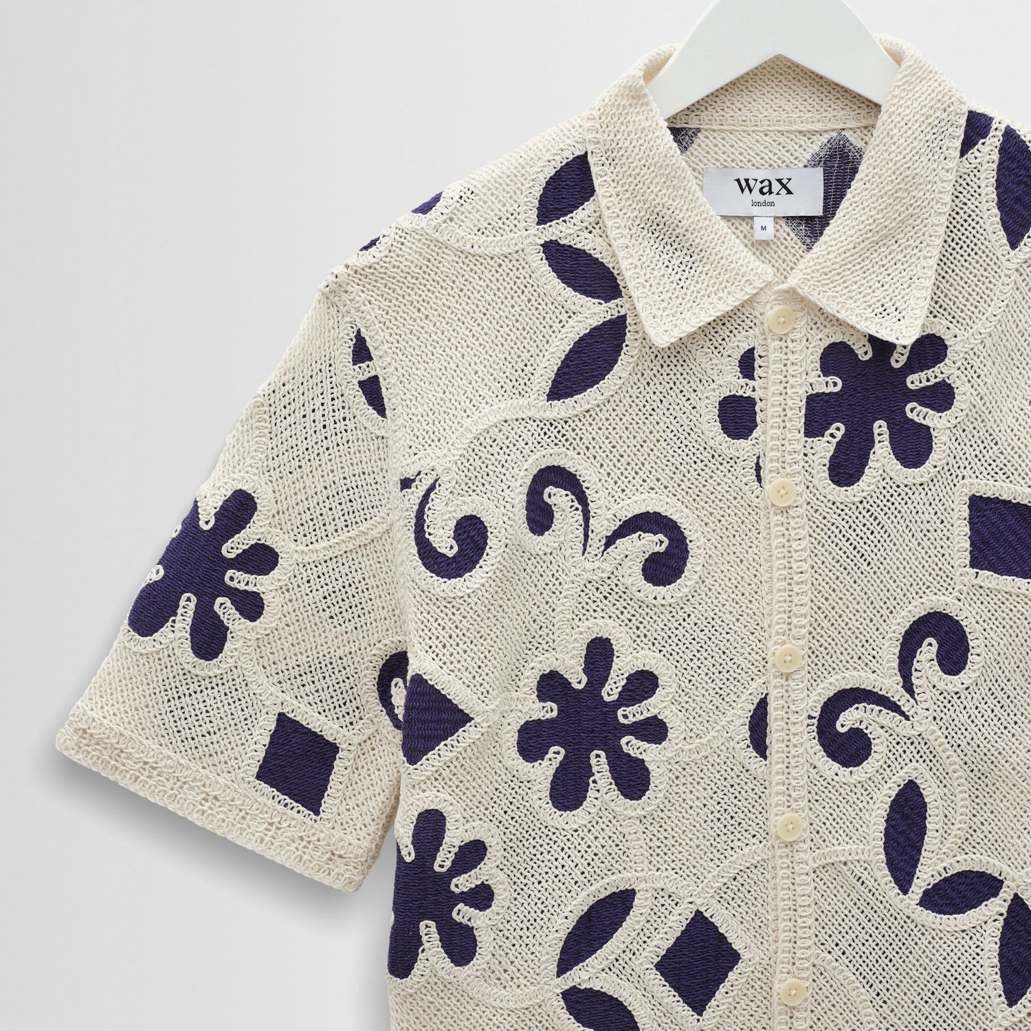 The Porto shirt is spring and summer style at its very best. This new stripe design is a  regular-fitting crochet shirt is constructed from a knitted cotton blend of blue, navy and ecru yarns. Perfect open with a tee or by its self!