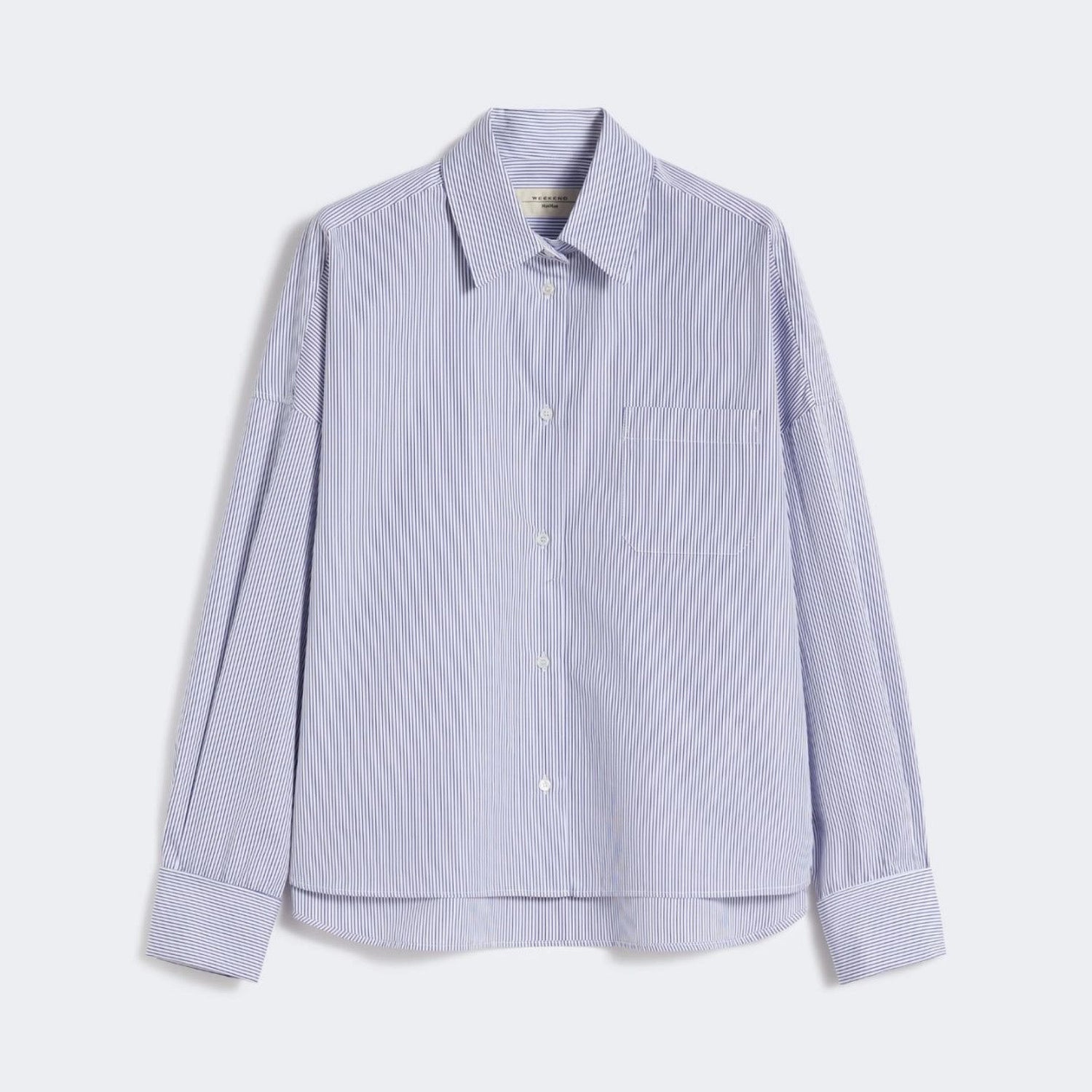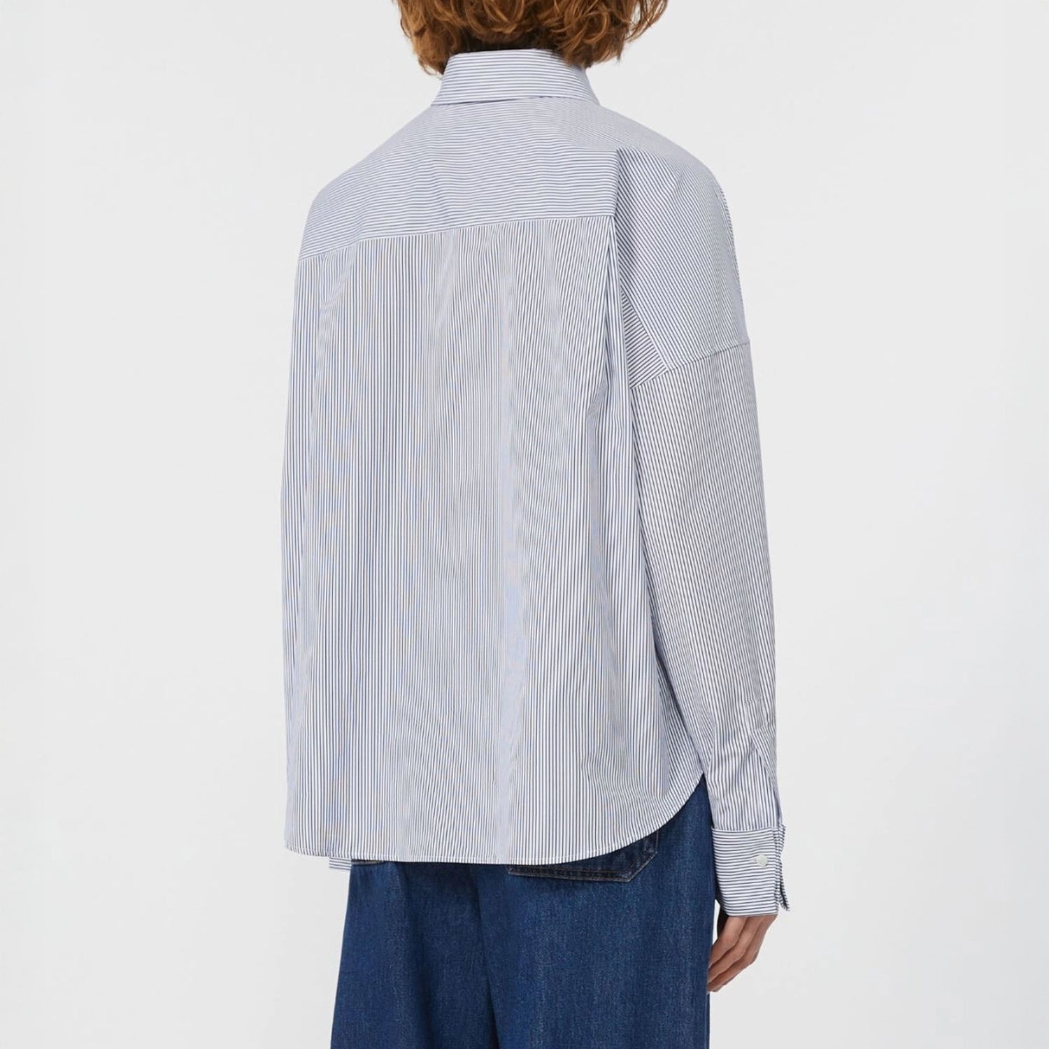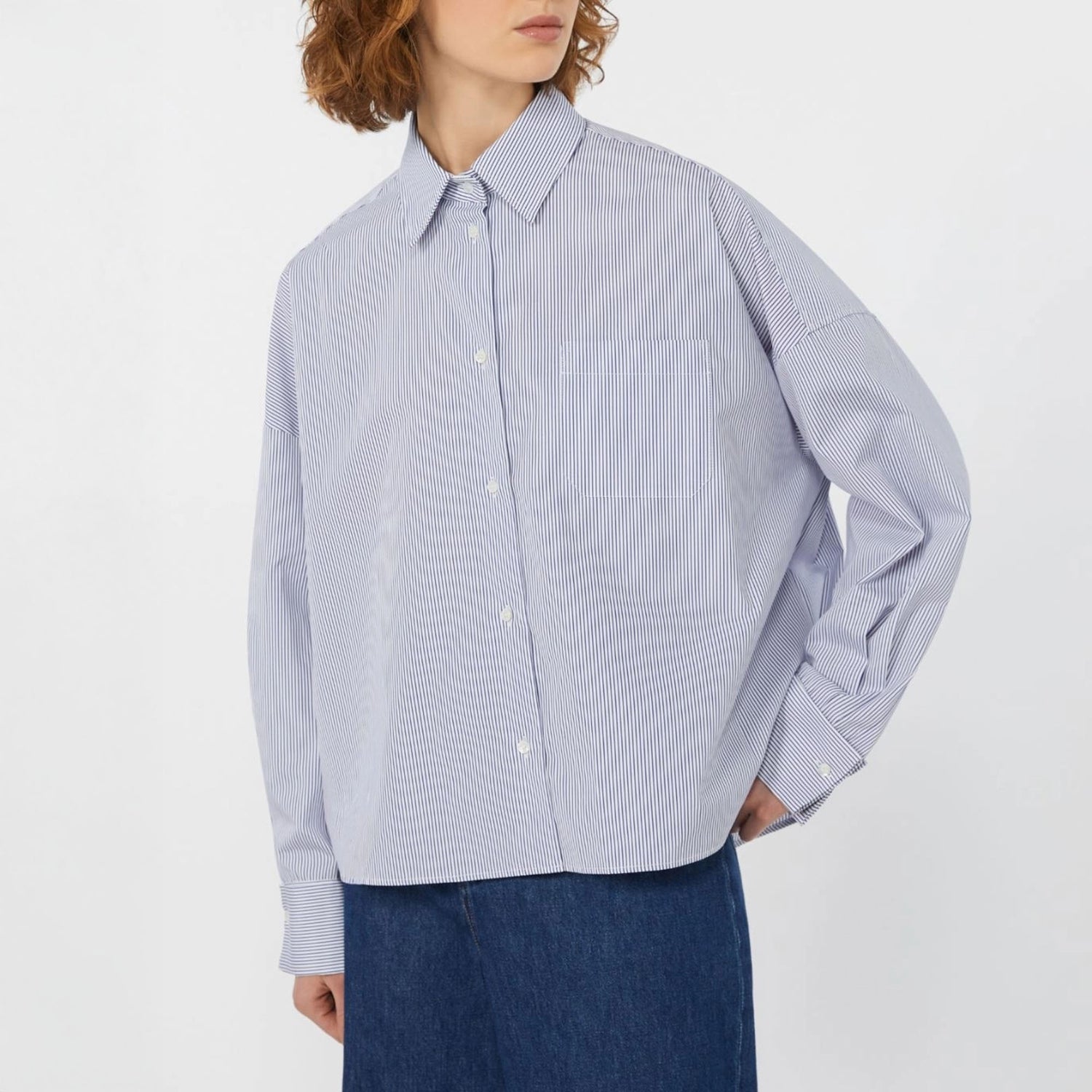 This pure cotton poplin shirt features an oversized, boxy silhouette cropped to the waist, with a softly rounded hem that dips longer at the back for a relaxed, modern look. Designed with low set-in sleeves and a sharp shirt collar, it includes wide cufflink-style cuffs and a visible front button placket for a tailored touch.