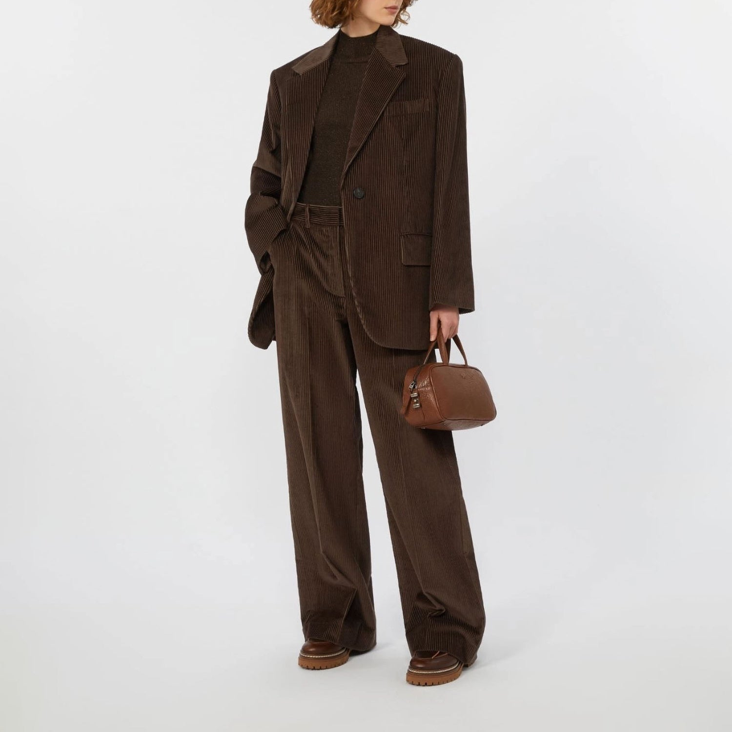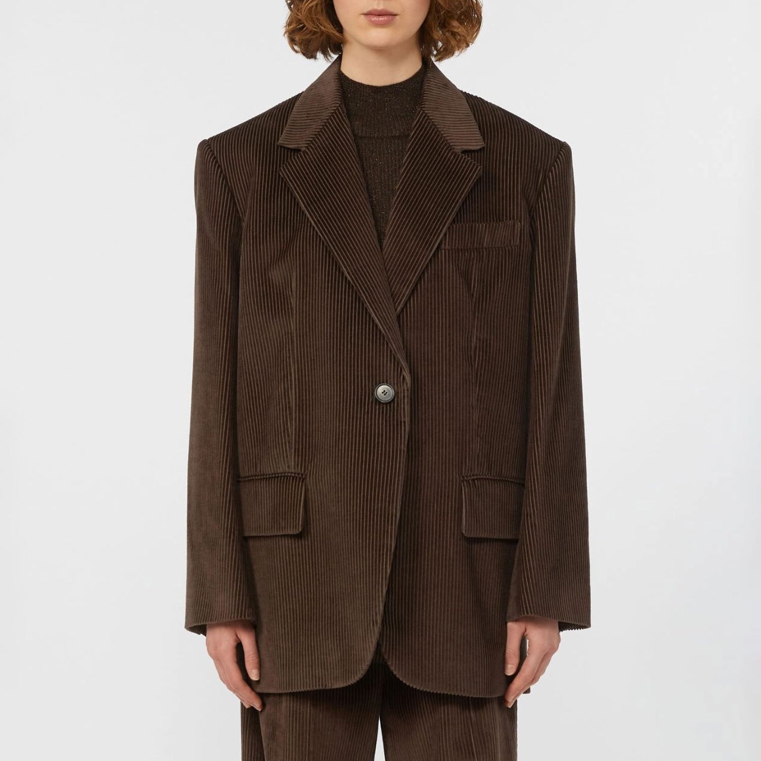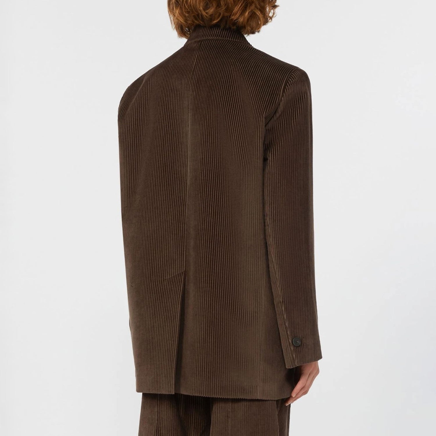 A fresh take on classic tailoring, this single-breasted blazer is crafted from rich nine-wale pure cotton corduroy. With a strong, menswear-inspired silhouette and exaggerated volume, it balances structure and softness—making it an effortless layer for the cooler months.