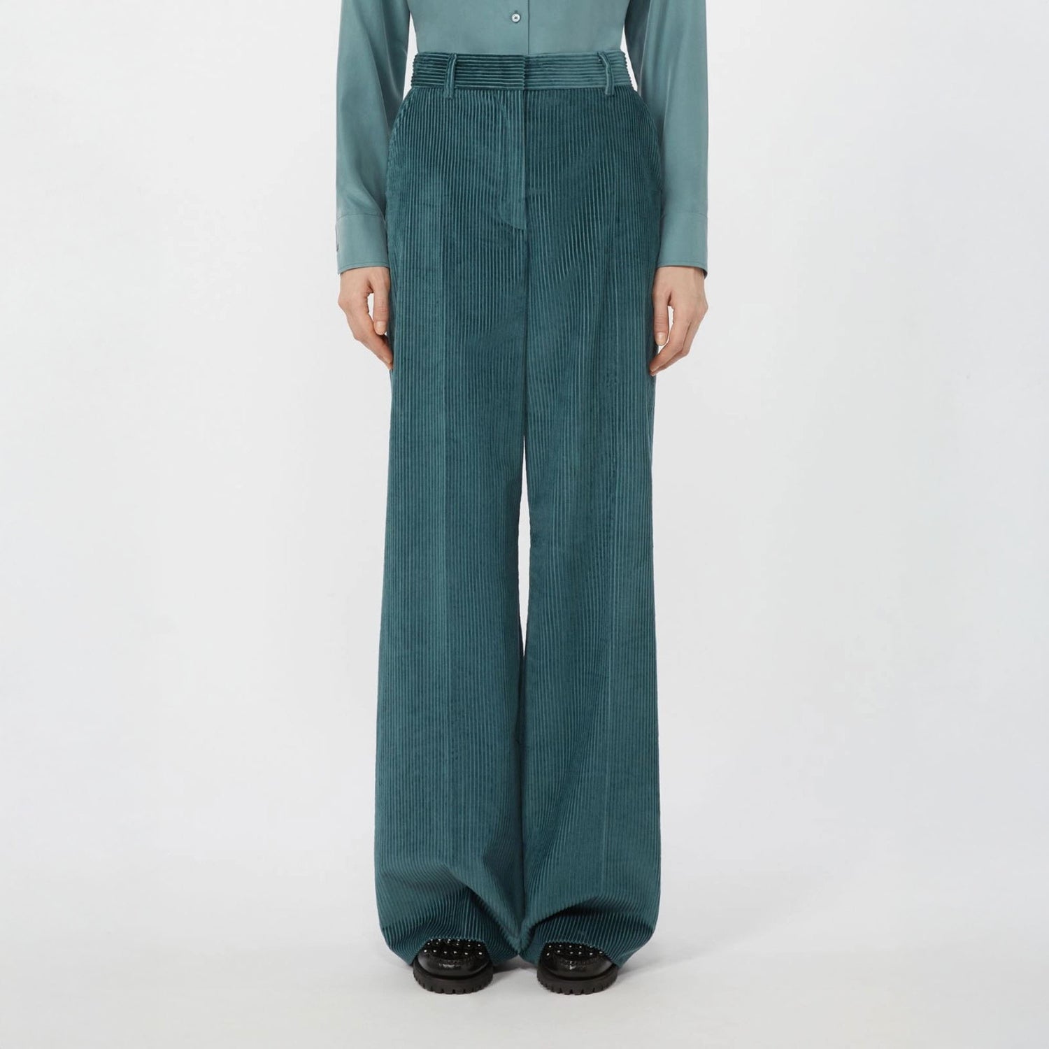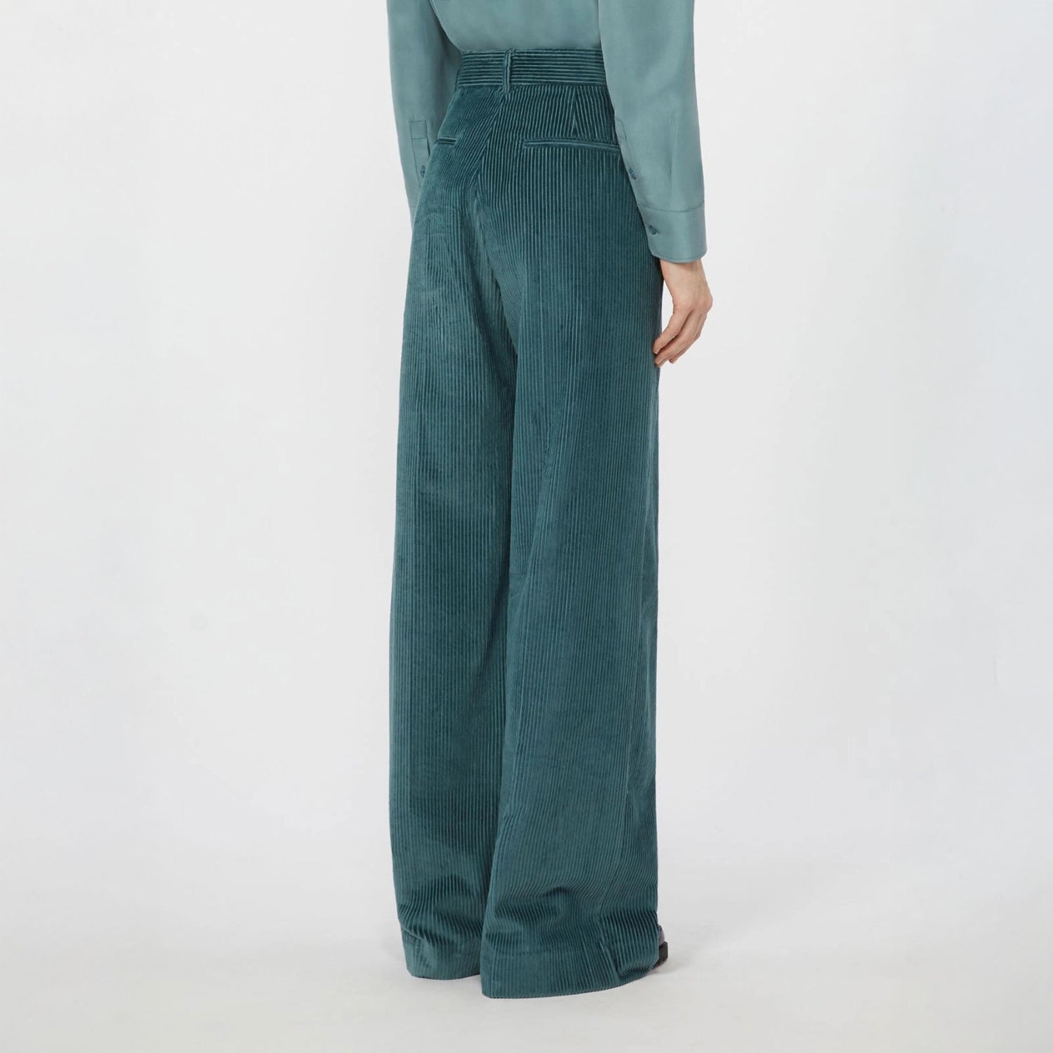 These long trousers feature a distinctive wide-leg silhouette, blending cool ease with formal polish. Made from nine-wale cotton velvet, they offer a soft texture with a structured drape. Ideal for elevating everyday looks or completing sophisticated ensembles with a modern edge.