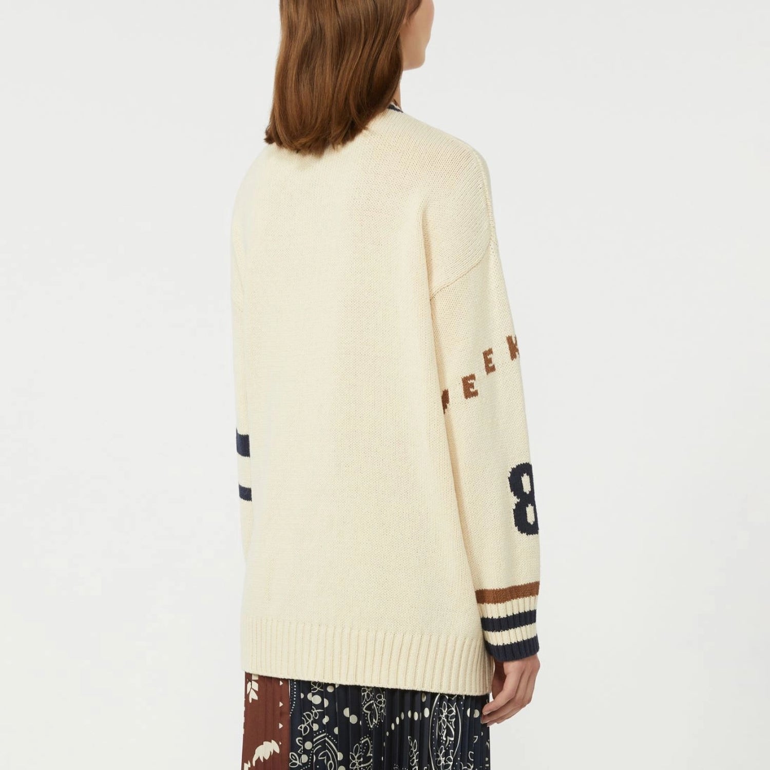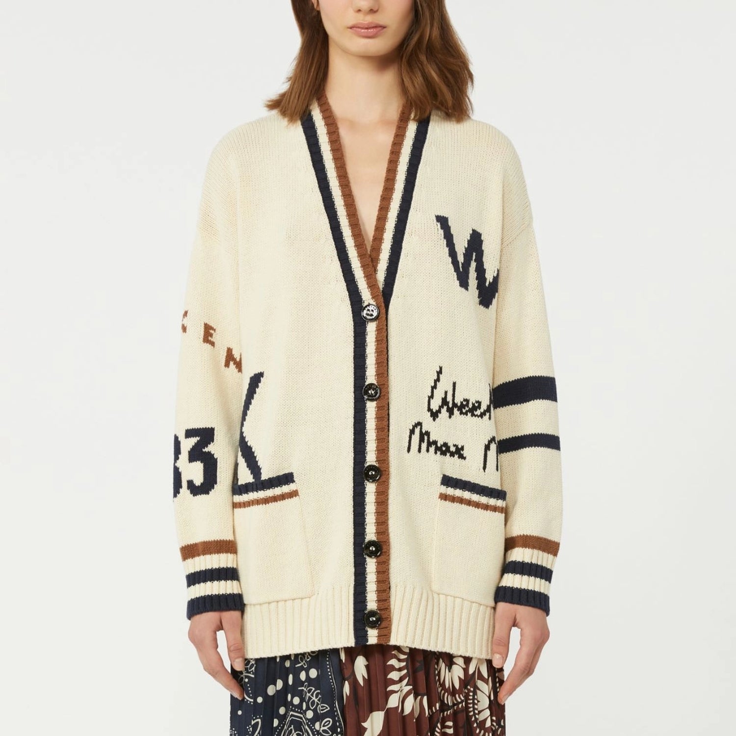 This oversized cardigan is crafted from a soft cotton-blend yarn and finished with contrasting inlaid details across the front and sleeves for a cool, modern twist. Designed in a loose, below-hip silhouette, it features a V-neckline, long low set-in sleeves and horn-look buttons that add a refined touch. Patch pockets and rib-knit trims with contrasting stripe detail complete the look, giving it a relaxed yet standout feel.