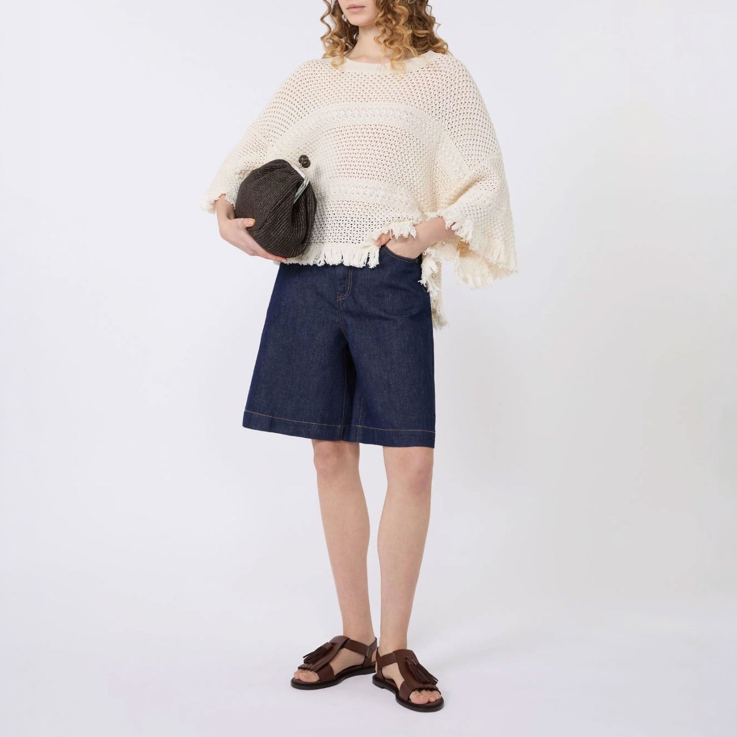 Short sweater in pure cotton yarn, featuring a mix of textured knits with fringe details along the edges. Designed with an oversized fit, it showcases moss and lace stitch work, a wide ribbed boat neck, and wide dropped sleeves for a relaxed yet distinctive look.