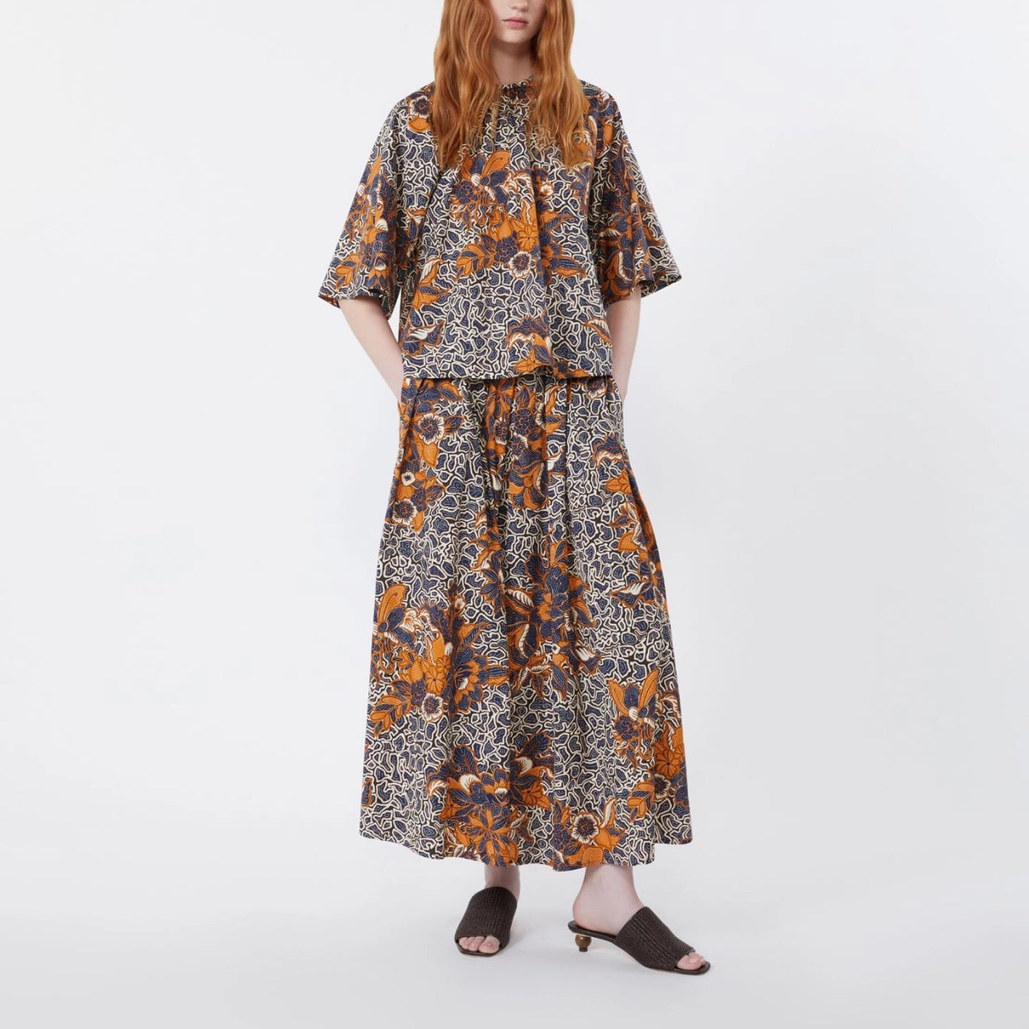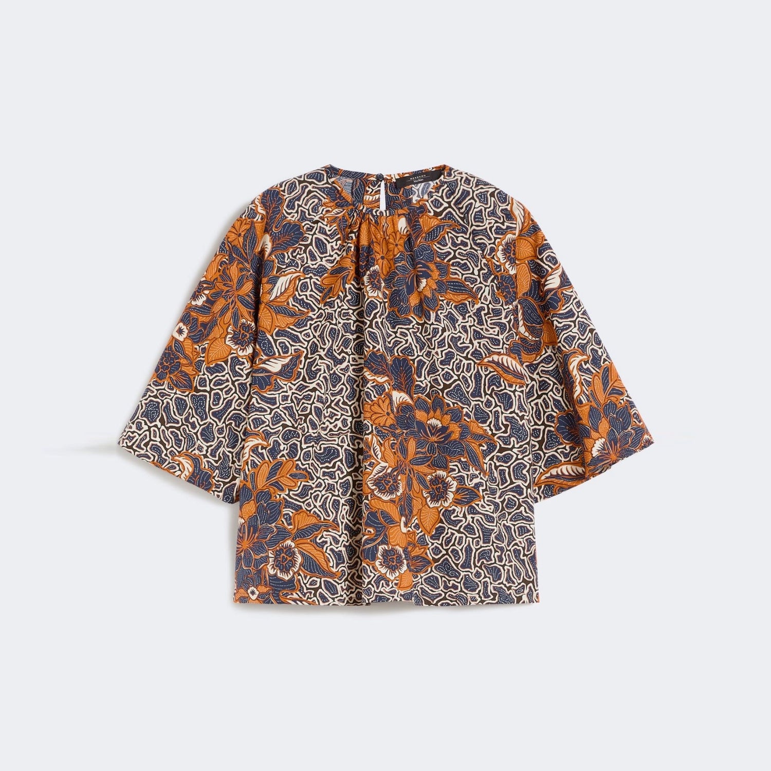 A blouse with a softly flared silhouette, featuring the collection’s all-over print. Crafted from pure cotton poplin, it has a loose fit with a crew neckline and gathered detailing at the front. Wide raglan sleeves add ease, while a teardrop opening with a button at the back finishes the look.