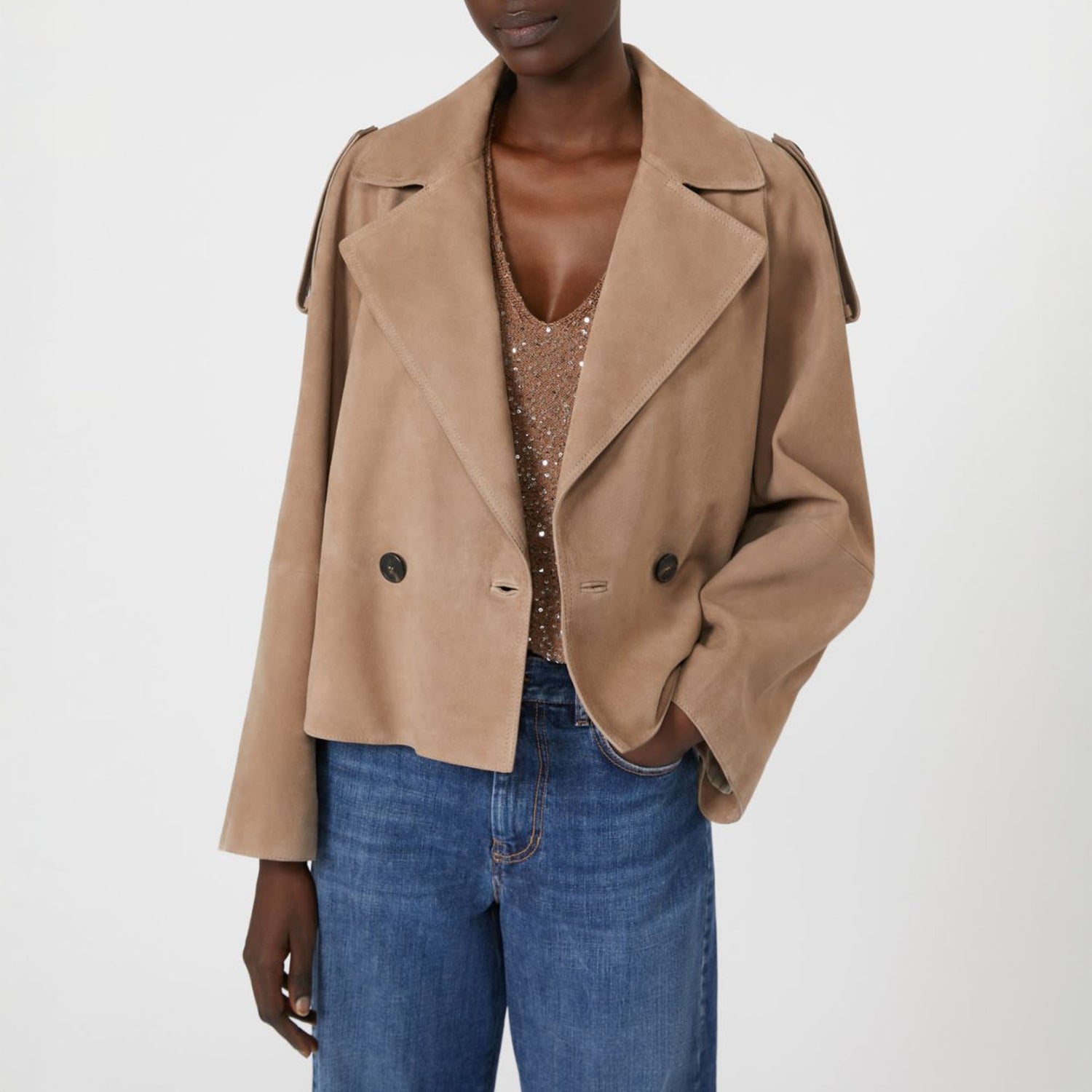 A classic icon reimagined in soft suede, this short trench coat is all about understated sophistication. Featuring traditional details like shoulder epaulettes and a rain cape, it’s tailored in a straight fit that layers beautifully over any look — from casual denim to office-ready ensembles.